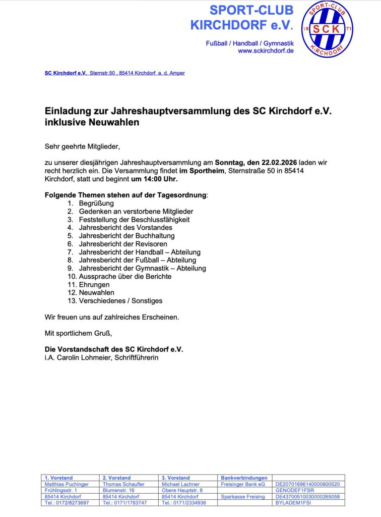 Die Vorstandschaft lädt zur diesjährigen Jahreshauptversammlung inklusive Neuwahlen am Sonntag, 22.02.2026 um 14:00 Uhr im Sportheim ein.